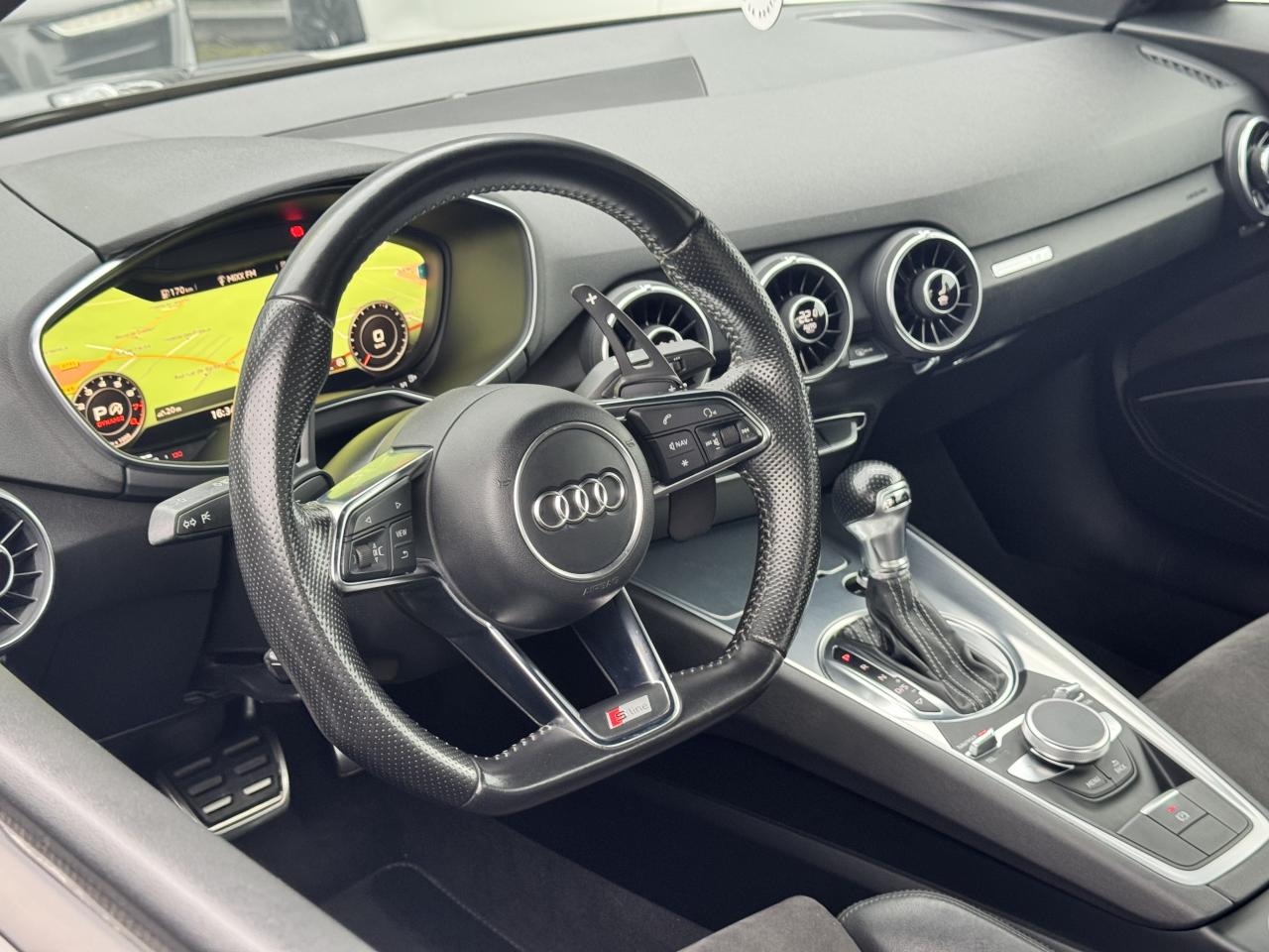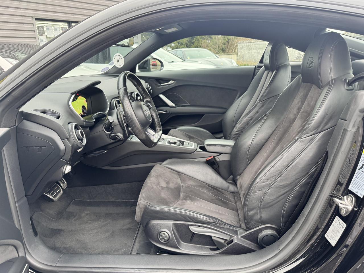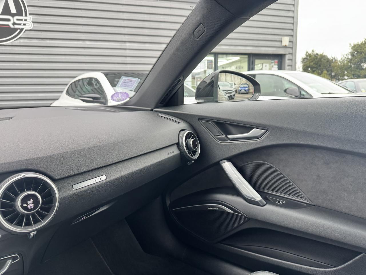 Audi Active Lane AssistAudi Drive SelectAudi parking system à l'arrièreAudi Singleframe, encadrement chromé de la calandre gris pierreAudi virtual cockpit, combiné d'instruments de 12,3 pouces, innovant, entièrement numérique, pour un affichage fonctionnel des informations. Commande de l'Audi virtual cockpit via le volant multifonction et le système MMIChâssis Sport S line avec réglage plus dynamique des ressorts et des amortisseurs, surbaissé de 10 mmClimatisation automatique "Confort"Direction progressiveEDS : blocage électronique de différentielFeux arrière à LED, Avec feux de recul et feux arrière de brouillard intégrésHabitacle et tableau de bord et ciel de pavillon en noirMMI Radio, intégré dans l'Audi virtual cockpit avec commande MMI séparé, incluant le menu CAR, Lecteur CDNavigation MMI plus avec MMI touchPack aluminium étenduPommeau du levier/sélecteur de vitesses en cuir perforé noirRecherche MMI, intelligente et complète par saisie de texte dans les menus Navigation, Téléphone, Radio, Médias et Véhicule ; accès direct via la fonction joystick du bouton poussoir (vers le haut)Régulateur de vitesseRétroviseurs extérieurs réglables électriquement et dégivrants avec clignotants intégrés à LED, boîtiers dans la couleur de carrosserie, miroir asphérique à gauche, convexe à droiteSellerie S line en tissu Séquence/cuir en noir avec estampillage S sur le dossier des sièges avantSièges Sport à l'avantStyle aluminium étendu à l'intérieur avec pédalier et repose-pied en acier inoxydableTrappe à carburant style aluminium design caractéristique avec estampillage TT et vis apparentesVitres athermiques teintées vertesVolant Sport S line en cuir avec multifonction style 3 branches aplati en bas, en noir (poignées de volant en cuir perforé) avec surpiqûres contrastées et emblème S line