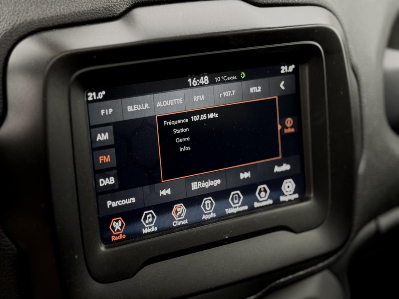 6 AirbagsAccoudoir central coulissantAide au démarrage en côteAide au stationnement arrièreBarres de toit longitudinales noiresClimatisation automatique bi-zoneConnexions Apple CarPlay et Android AutoContrôle électronique de stabilité (ESC)Dossier siège passager rabattable à platFrein de parking électriqueJantes alliage 16" AuthenticityOrdinateur de bord avec écran digital 3.5'' TFT monochromePoignées de portes couleur carrosserieProjecteurs antibrouillard avant avec éclairage statique d'intersectionReconnaissance des panneaux de signalisationRégulateur de vitesse et limiteur de vitesse intelligentRétroviseurs extérieurs couleur carrosserieRétroviseurs extérieurs électriques et dégivrantsSellerie tissuSystème à écran tactile Uconnect Live 7"Système d'avertissement de franchissement de ligne avec correctionSystème Stop & StartVolant réglable en hauteur et en profondeur