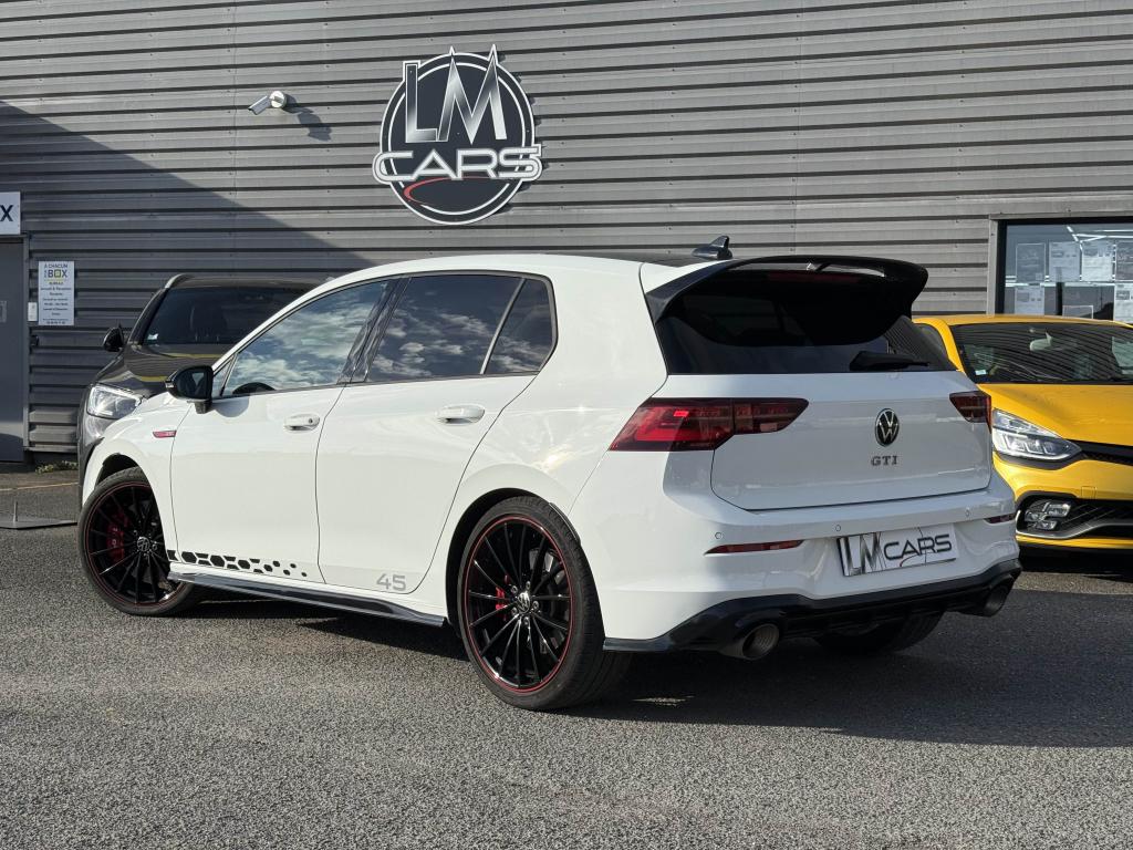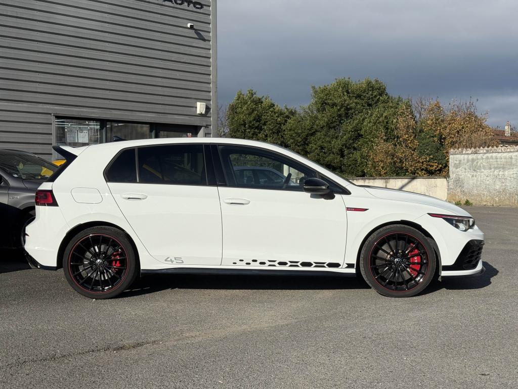 ‘Keyless Access Advanced’ sans alarme : Système de verrouillage/déverrouillage et de démarrage sans clé2 interfaces USB-C à l'avant et 2 prises de chargement USB-C derrière l’accoudoir pour les passagers arrière2 spots de lecture à l'avant et à l'arrière7 haut-parleursAccoudoir central arrière rabattable et deux porte-gobeletsAccoudoir central avant réglable en hauteur et en profondeur avec compartiment de rangementActivation automatique des feux de détresse en cas de freinage d'urgenceAirbags conducteur et passagerAirbags de «tête» passagers avant et arrièreAirbags latéraux avantAlerte de perte de pression des pneusAntipatinage électronique ASRApp-Connect sans filApplications décoratives "Black Metal Chrome" pour le tableau de bord et les revêtements de portes à l'avantAssistance au contrebraquageAssistance au freinage d'urgenceAssistant de changement de trajectoire "Side Assist"Augmentation de la limitation électronique de vitesse maximale à 270 km/hBadge GTi sur les ailes avant et le volet arrièreBaguette lumineuse entre les projecteursBanquette arrière rabattable 2/3 - 1/3 avec trappe à skisBecquet arrière de pavillon noir en deux partiesBlocage de différentiel d'essieu avant ‘VAQ'Boîtiers des rétroviseurs extérieurs noirsCiel de pavillon noir soulClimatiseur "Air Care Climatronic" 3 zones et filtre anti-allergène et éléments de commandes à l'arrièreCompartiment de rangement et prise 12 V à l' AVCorrecteur électronique de trajectoire ESPDiffuseur arrière spécifique ‘GTI Clubsport 45'Digital Cockpit Pro : combiné d’instruments digital avec écran digital haute résolution couleur de 10.25”Direction progressiveEclairage à LED de la plaque d'immatriculation arrièreEclairage d'ambiance - 30 couleurs et éclairage de plancher à l'avantEclairage d'ambiance extérieur : poignées de portes éclairées et éclairage périmétrique avec projection du logoEclairage de plancher à LED à l'avant avec possibilité de sélectionner la couleur d'éclairageEtriers de frein rouge à l'avant et à l'arrièreFatigue Detection : Système de détection de fatigue du conducteurFeu arrière de brouillard d’un côté, feux de recul des deux côtésFixation pour siège enfant ISOFIX (arrière, x2)Frein de stationnement électromécanique avec fonction d’immobilisation en pente ‘Auto hold’ et assistant de démarrage en côteFreins à disque 18” à l’avant et 17” à l’arrièreFront assist avec freinage d’urgence et détection de piétonsIndicateur de température extérieure avec avertisseur de gelInscription 45 sur les jupes latérales et sticker noirInterface Bluetooth pour téléphone portable (mains-libres)Interface téléphonique avec fonction de charge inductiveJantes en alliage 8J x 19’’ ‘Scottsdale’ noires avec liseré rouge, écrous antivol et pneumatiques 235/35 R19Lane Assistant : assistant de maintien dans la voieLave-essuie-glace arrière à balayage intermittentLimite électronique de vitesse maximale relevée à 270 km/hLiseré rouge dans la calandre et les pharesMiroirs de courtoisie éclairés intégrés aux pare-soleilPack Travel Assist: combinaison du Lane Assist, du Side Assist, du Régulateur de distance et de l'Emergency Assist qui interagissentPack visibilitéPalettes au volantPare-chocs avant et arrière spécifiques GTI Clubsport 45, prise d'air en structure nid d'abeilles à l'avantPark Assist : Système d'assistance au stationnement en créneau et en bataillePédalier et repose-pied en acier inoxydable brosséPeinture unie Blanc PurPoignées de portes couleur carrosseriePrise 12V dans le coffreProjecteurs IQ.Light - Matrix LEDProtection antidémarrageRear Assist : Caméra de recul avec visualisationRéception radio numérique DAB+Régulateur électronique de couple MSRRépartiteur électronique de freinage EBVRétroviseur intérieur électrochromeRétroviseurs extérieurs rabattables et réglables électriquement, avec fonction mémoire et dégivrage séparéSélection du profil de conduiteSellerie sport spécifique en microfibre/tissuSiège du conducteur avec réglage en hauteurSiège passager réglable manuellement en hauteurSièges sport à l'avant spécifiques GTI Clubsport 45 avec appuis-tête intégrés et appuis lombaires à l'avantSign Assist: Reconnaissance des panneaux de signalisation et affichage sur le ‘Digital Cockpit’ et l’écran du système de radionavigationSortie d’échappement ovale Akrapovic à gauche et à droiteSystème d'antiblocage des roues ABSSystème de Freinage anti-multicollisionSystème Navigation & Infotainment ‘Discover Media’ avec «Services de streaming et radio via Internet»Système Start/ Stop avec récupération d'énergie de freinageTapis de sol avant et arrièreTémoin et alerte sonore de non-bouclage des ceintures de sécurité avant et arrièreToit noirTrains roulants sportVerrouillage centralisé avec télécommande à fréquence radio par clé rétractableVitres arrière et lunette arrière surteintées à 65%Vitres avant et arrière électriquesVolant réglable en hauteur et en profondeurVolant sport multifonction en cuir spécifique GTI Clubsport 45 avec commandes tactiles, retour haptique
